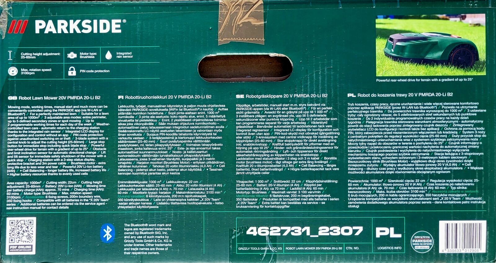 * Sterowana aplikacją (WiFi/Bluetooth), akumulator 4 Ah (70min koszenia, 60min ładowania),